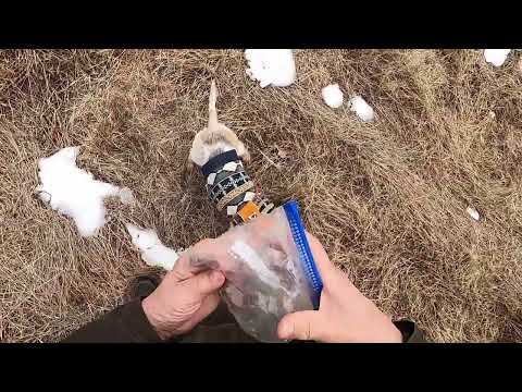 Start very good. First leg dead on, she wasn't even fooled by the obvious cross-tracks--human and animal. Clear loss of scent on first corner and very quick discovery of second leg. She was very good and determined on second leg, although I seem at times to be following the track and not Millie--I wasn't consciously guiding, although that seemed to be the effect. Millie went straight into the the third leg with no difficulty whatsoever, an achievement since we were crossing some very distracting territory. Nice indication of first article. After checking left, she picked up the fourth leg nicely again. Fourth leg crossed diagonally from snow to a bare strip and back again to snow, none of which gave her any trouble at all. On the fourth corner her head went right immediately, but she showed a little more confusion as she went some distance on, and it took a bit of work for her to pick up the fifth leg. Fifth corner was no problem, although I accidentally restrained her at first, which fortunately neither discouraged nor confused her--SHE knew where the track was. She had to work a bit at the last turn (right): she kept wanting to check left, but eventually settled on right. (I'm not sure about my handling here--in the video it looks as though I was starting to turn my body, which she might have cued off of, but it is also possible I was just turning my head to follow her. Nice work on last leg, but although she was tracking only about 1-2 feet wide at the end, she barely noticed the final article.