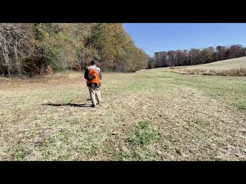 November 11 -- Millie Class. Three starts, two with blind turns. Cover close-cut soybeans. Sunny. Cold (upper 30s-low 40s), strong breeze, low humidity. First track (≅1 hour?). Millie found the first leg with minimal effort at the start, and stuck to the track reasonably well. At the corner, however, both of us fell into confusion. She did register loss of scent more or less at the right place, but then had great difficulty finding the second leg--we both struggled (my handling hurt more than helped her through the problem), and we could only get back with assistance. Even after being put back on the track we had a hard time staying with the second leg. In consequence, the two remaining tracks were double-laid with considerably more food drops. Second Track (again ≅1 hour after being relaid). A good start and first leg again. This time she found the second leg after going some distance through the corner, but showed discernable loss-of-scent behavior again. Third Track (about 2 hours old after being relaid.) Started well; stopped several times to go back a step or two to find food drop, but otherwise stuck to the track--only tried exploring off track once, which I quickly stopped. Found the turn without much searching, and then proceeded to follow the track through an overgrown gully and through to the final article--by far her best track of the three.